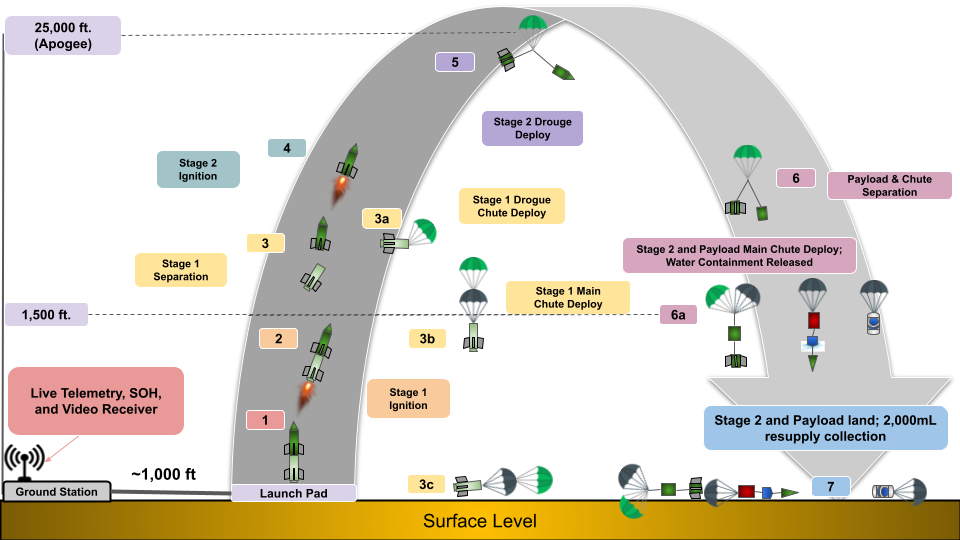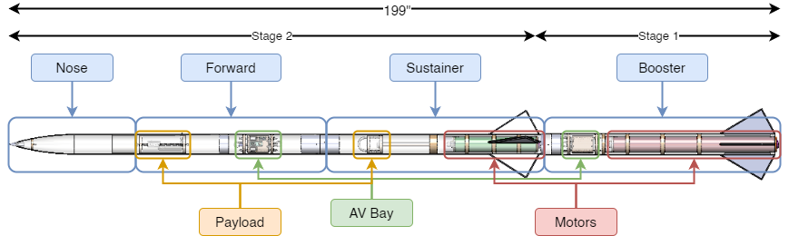 This is the rocket design that the team has come up with. It has four sections: Nose, Forward, Sustainer, and Booster. The rocket will feature a payload in two locations being the forward section and the sustainer section, both payloads will feature cameras, one for live streaming to the ground station and the other to store record of the entire flight. Avionics will also be located in two parts of the rocket, the Forward and the Booster section; the avionics will be in charge of making sure the recovery components deploy at the correct times. Lastly the rocket will feature two motors, the N3300R and the M2400T both from Aerotech.
